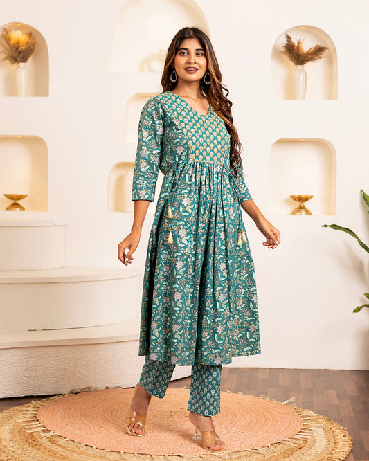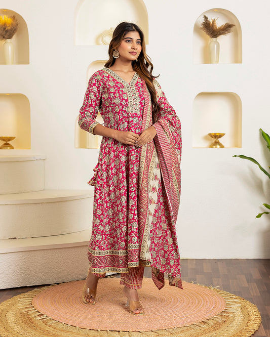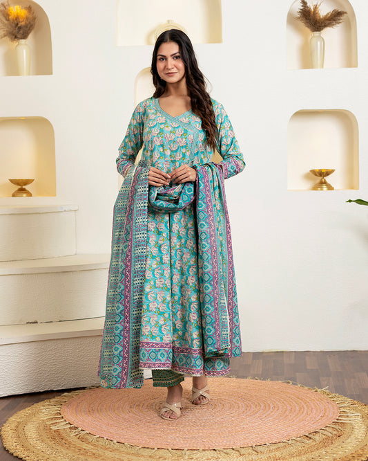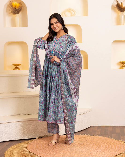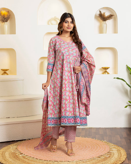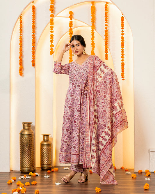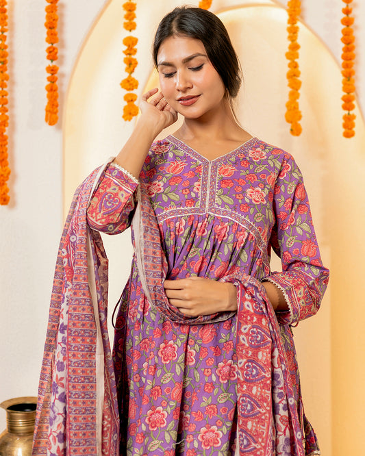 Gulab Noor Printed Anarkali Cotton Suit Set