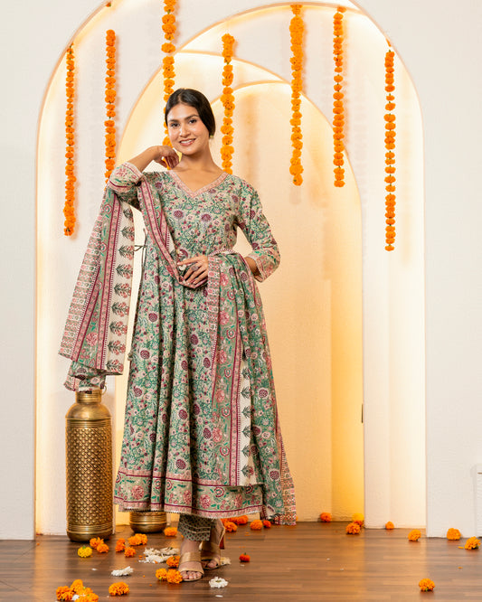 Jahan Noor Green Handprinted Anarkali Suit Set