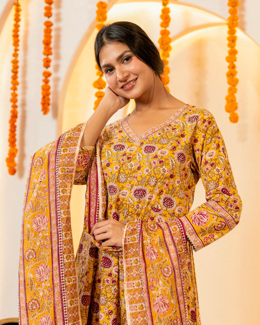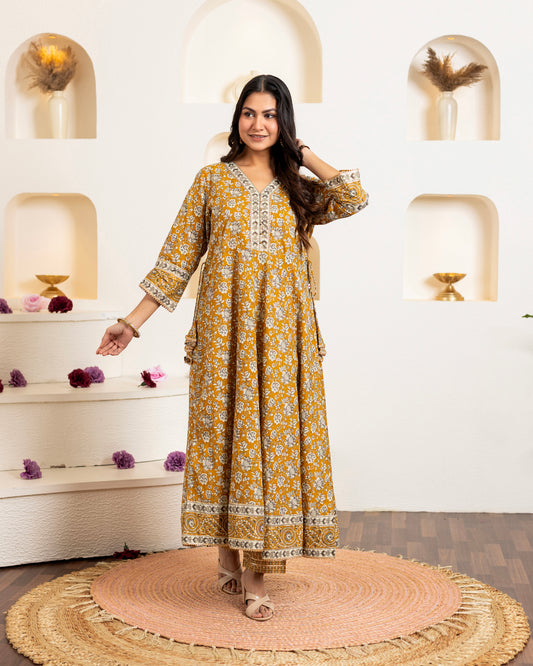 Jahan Noor Mustard Yellow Anarkali Cotton Suit Set