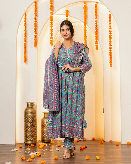 Tara Noor Printed Lilac Blue Anarkali Suit Set