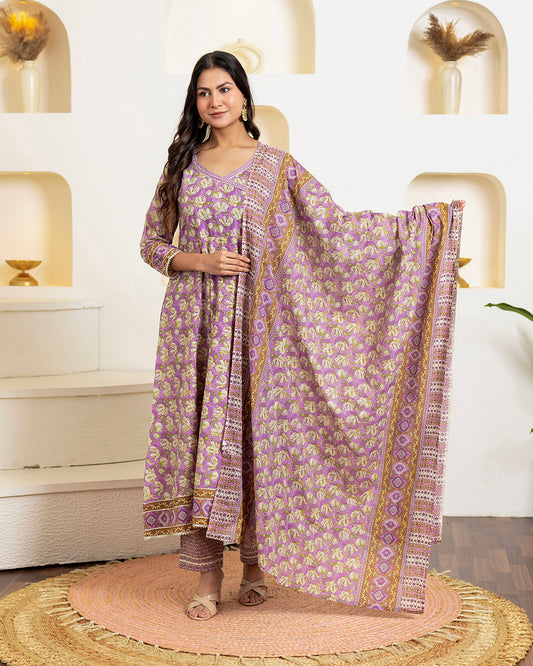 Chand Noor Purple Handprinted Anarkali Suit Set
