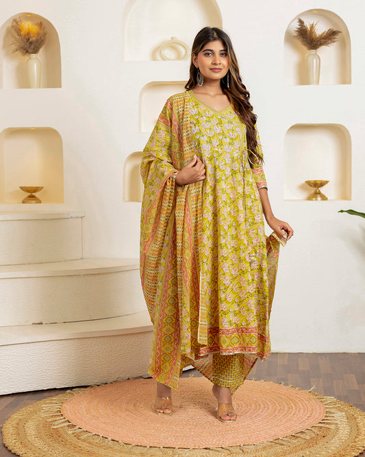 Kohi Noor Handprinted Yellow-Green Suit Set
