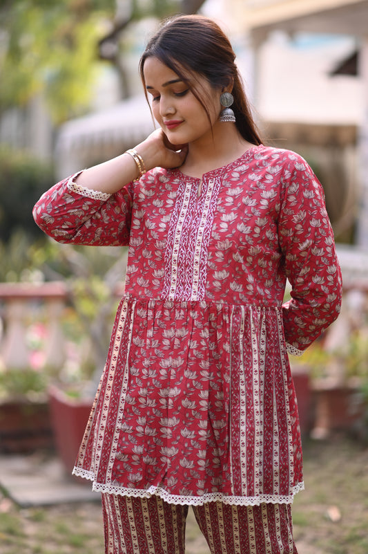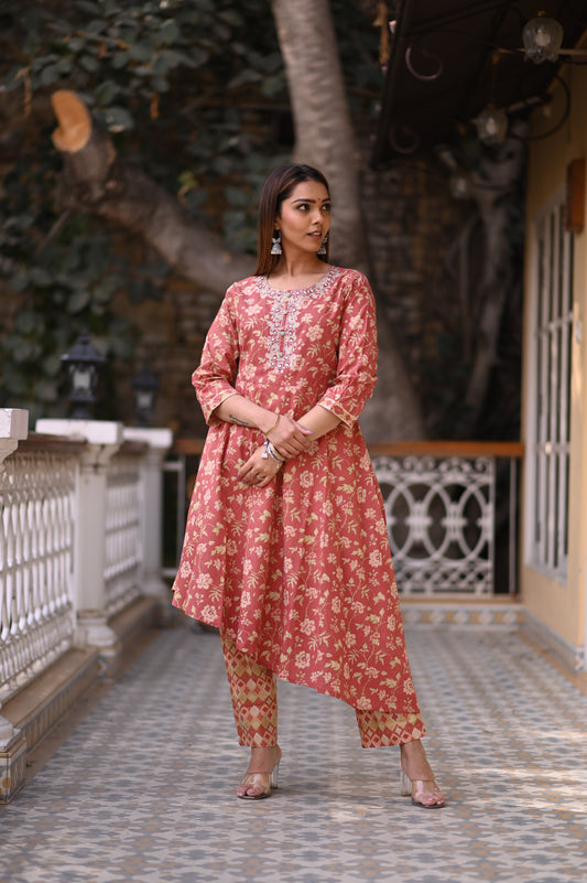Arohi - an elegant soft red floral co-ord set