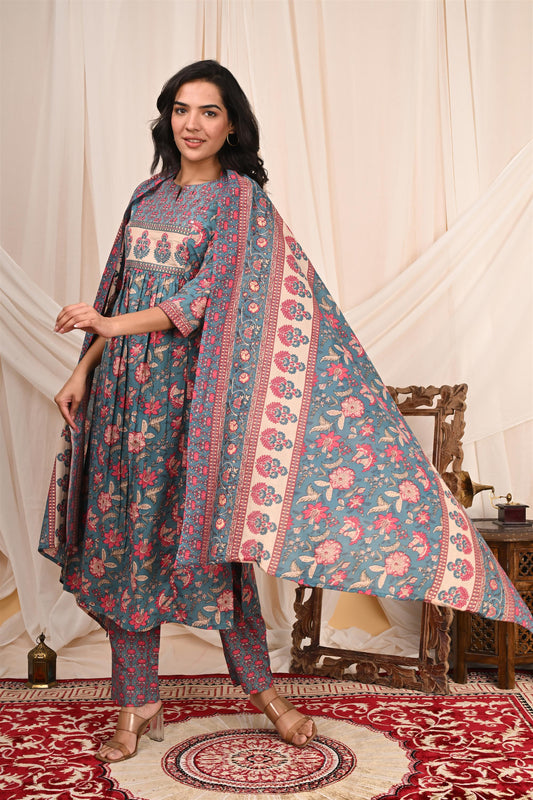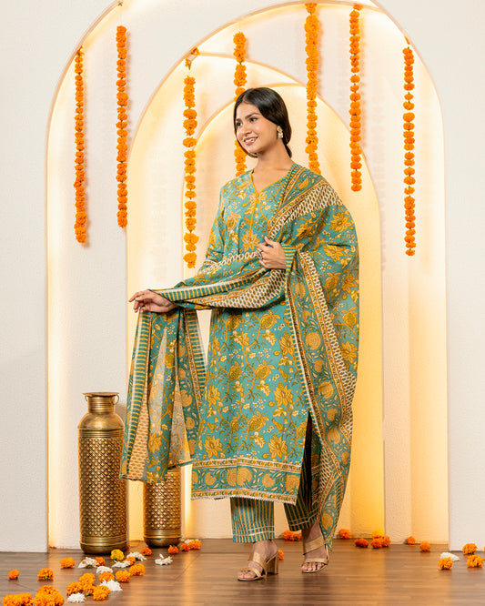 Noor Ayat Teal Blue & Mustard Floral Jaal Printed Cotton Suit Set