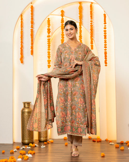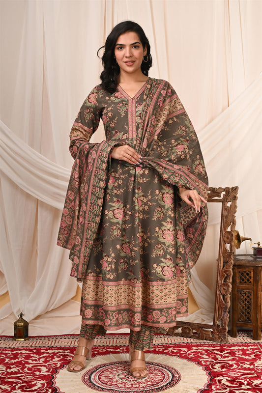 Noor Ayat Olive Green Floral Printed Cotton Suit Set