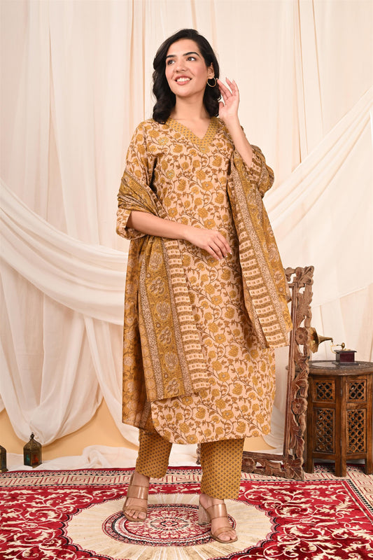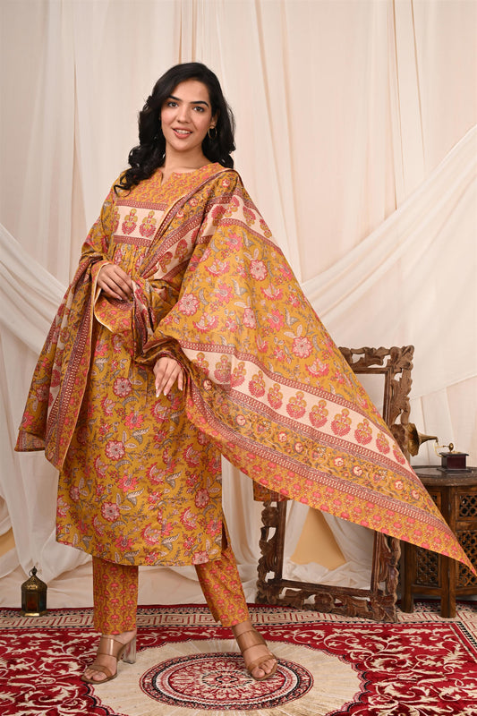 Kalpana Chhavi Mustard Yellow Printed Cotton Suit Set