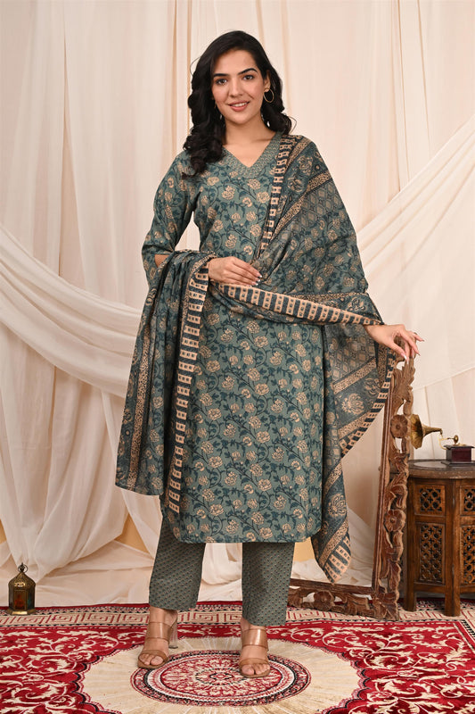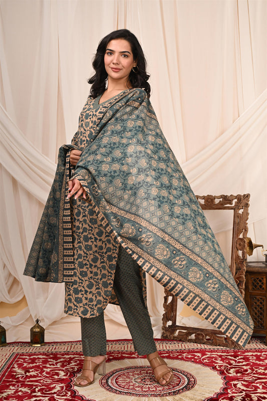 Kalpana Taraash Teal Beige Floral Printed Cotton Suit Set